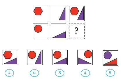 With this question type, a child is presented with a series of objects that combine, invert, transform and/or rotate across rows and columns. The child must identify the rule for the top row of objects and then predict what will happen to objects in the second (or third) row. She must then select which object among the answer choices follows this rule and should go in the empty box in the matrix.