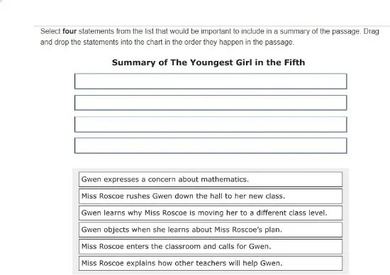 Fifth grade students are tested on higher level reading comprehension and writing skills. Students answer questions based on both informational and literary passages, in addition to some video and audio content. Questions assess the ability to do the following: