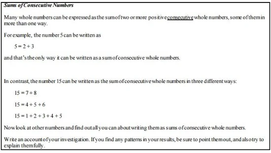 Students may also be asked to complete longer “investigations” to demonstrate the ability to communicate reasoning, as in the example below:
